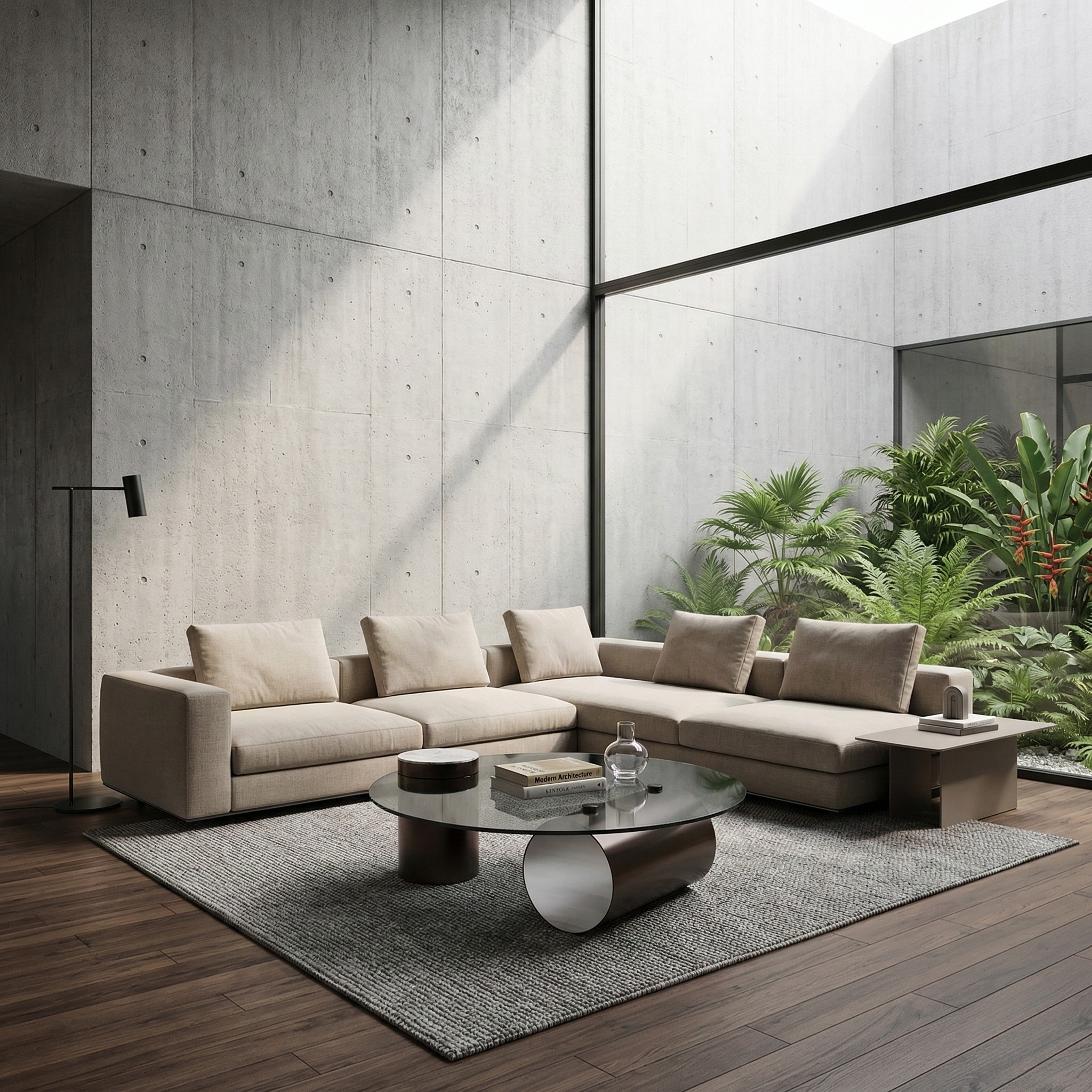 Brushed dark brown stainless steel forms the base in bold, architectural cylinders, grounding the piece with a clean, sculptural stance. Sized for modern lounge settings, Heviz sits comfortably within generous seating layouts while keeping the space open and light.