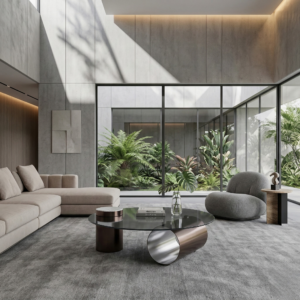 Heviz is defined by contrast, transparent surface clarity paired with the depth of natural stone. A 10mm grey tempered glass top reveals and frames carefully placed Earl White natural marble inserts, bringing a quiet sense of luxury to the composition.