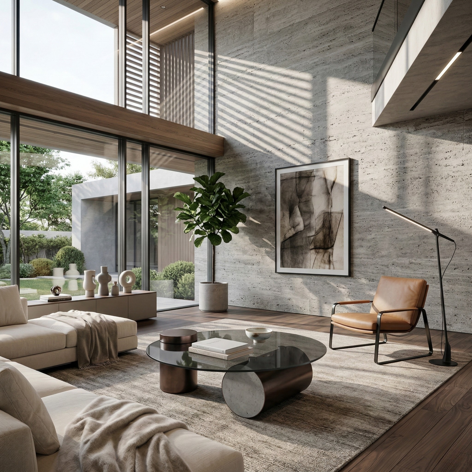 Brushed dark brown stainless steel forms the base in bold, architectural cylinders, grounding the piece with a clean, sculptural stance. Sized for modern lounge settings, Heviz sits comfortably within generous seating layouts while keeping the space open and light.