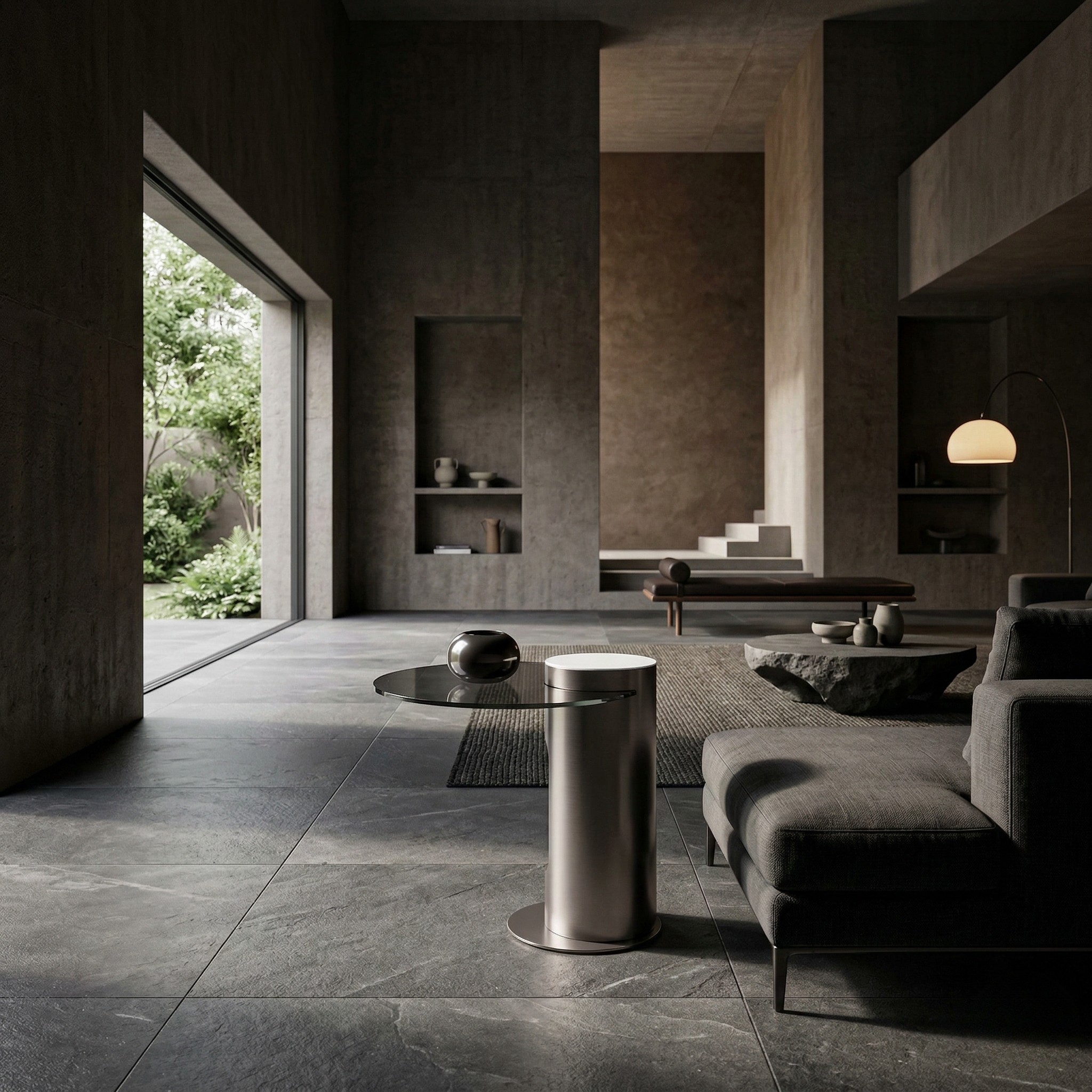 Heviz is defined by a clean cylindrical pedestal and a floating circular top, designed to sit neatly beside sofas and lounge chairs. The offset surface brings everyday essentials closer, while keeping the overall profile calm and architectural.