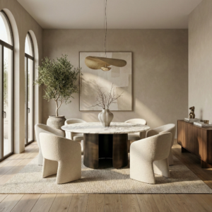 Ilmadia brings an architectural calm to the dining space through a clean circular top and a bold, grounded pedestal form. The proportion is designed to seat evenly and encourage conversation, making it ideal for modern homes and hospitality settings.