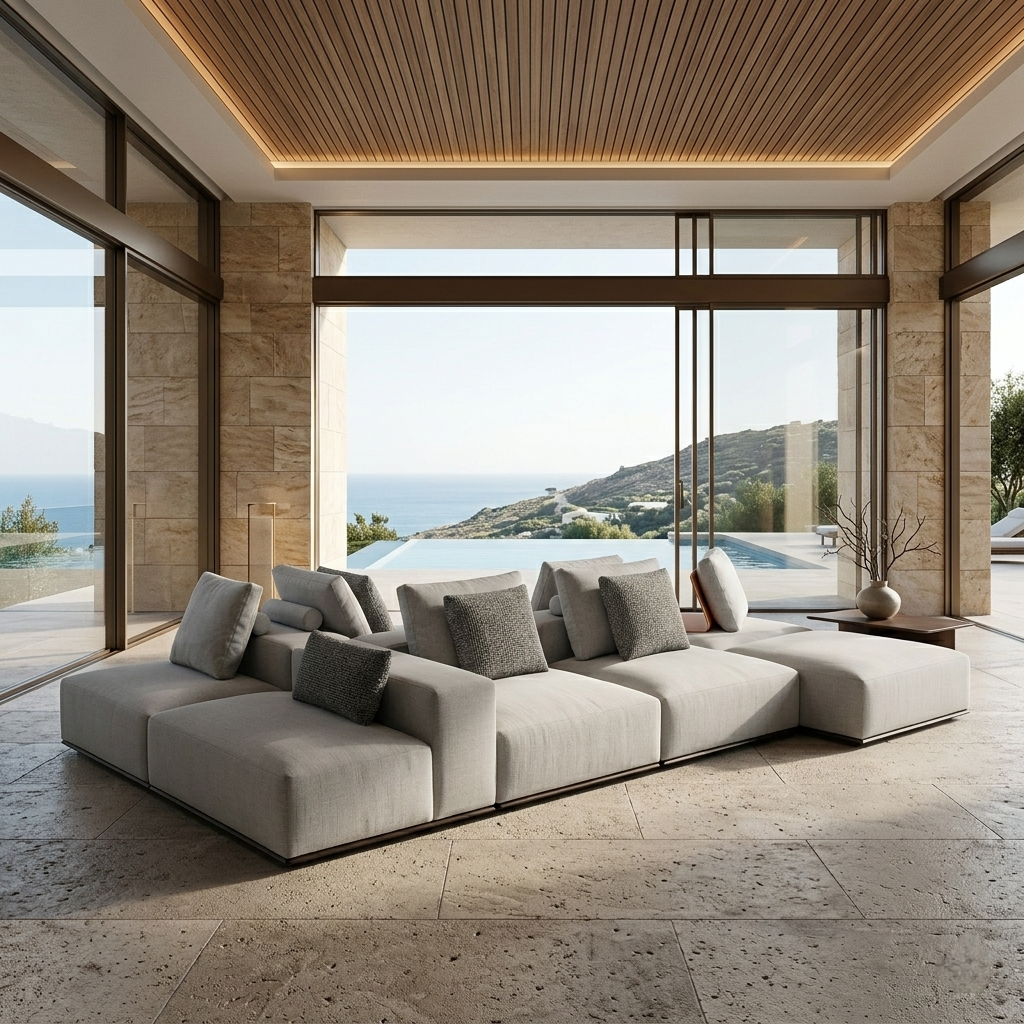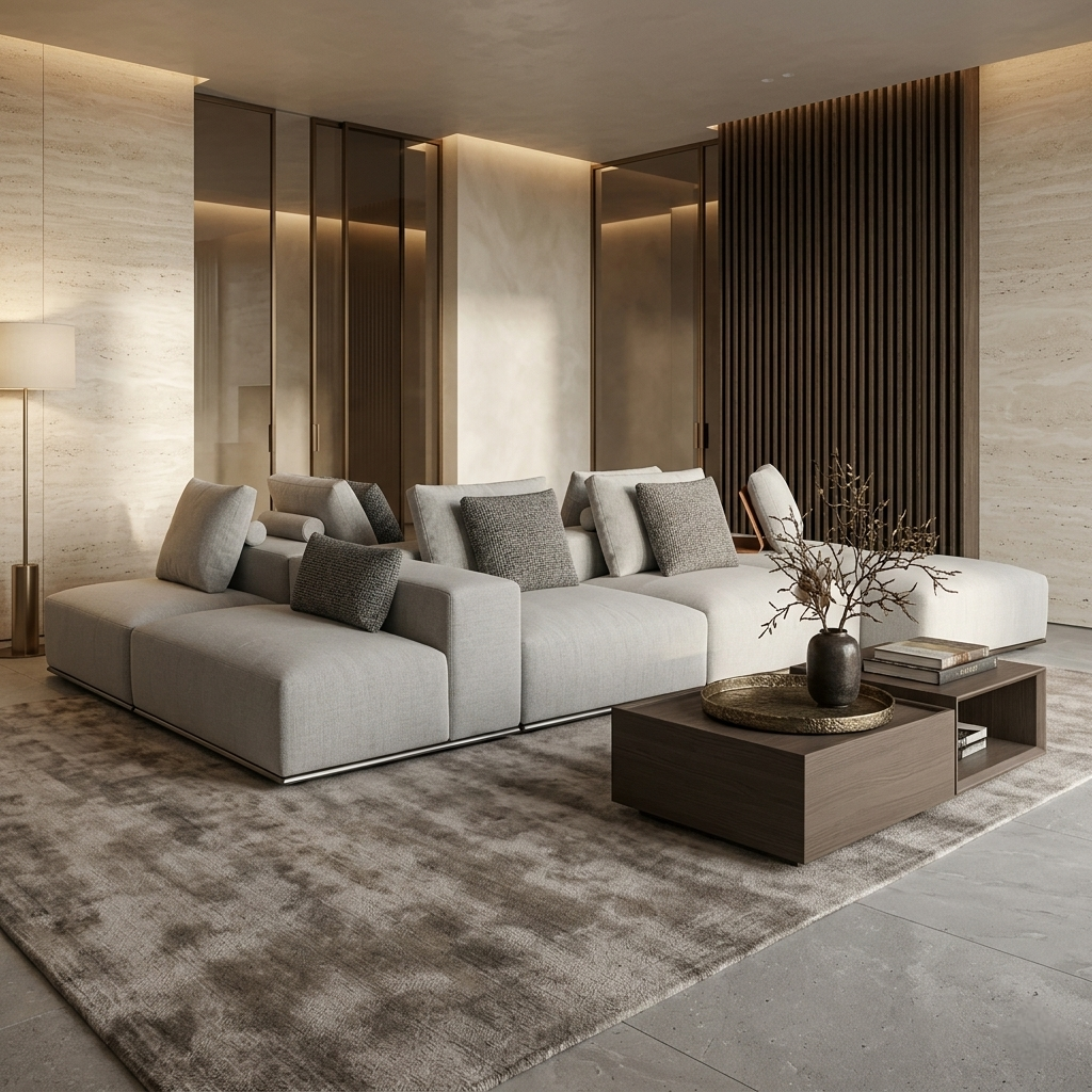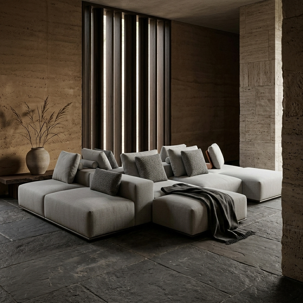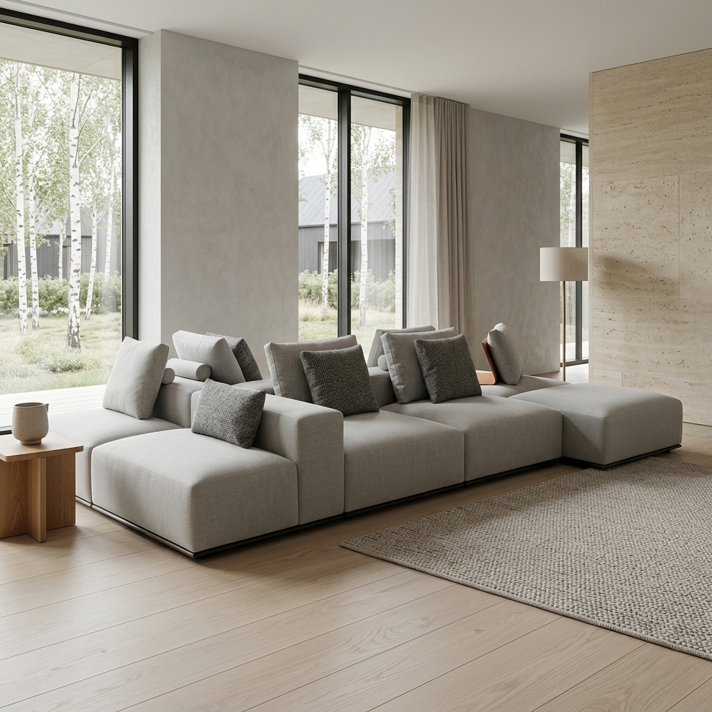 A refined modular sofa designed for adaptable living, layered comfort, and architectural clarity.