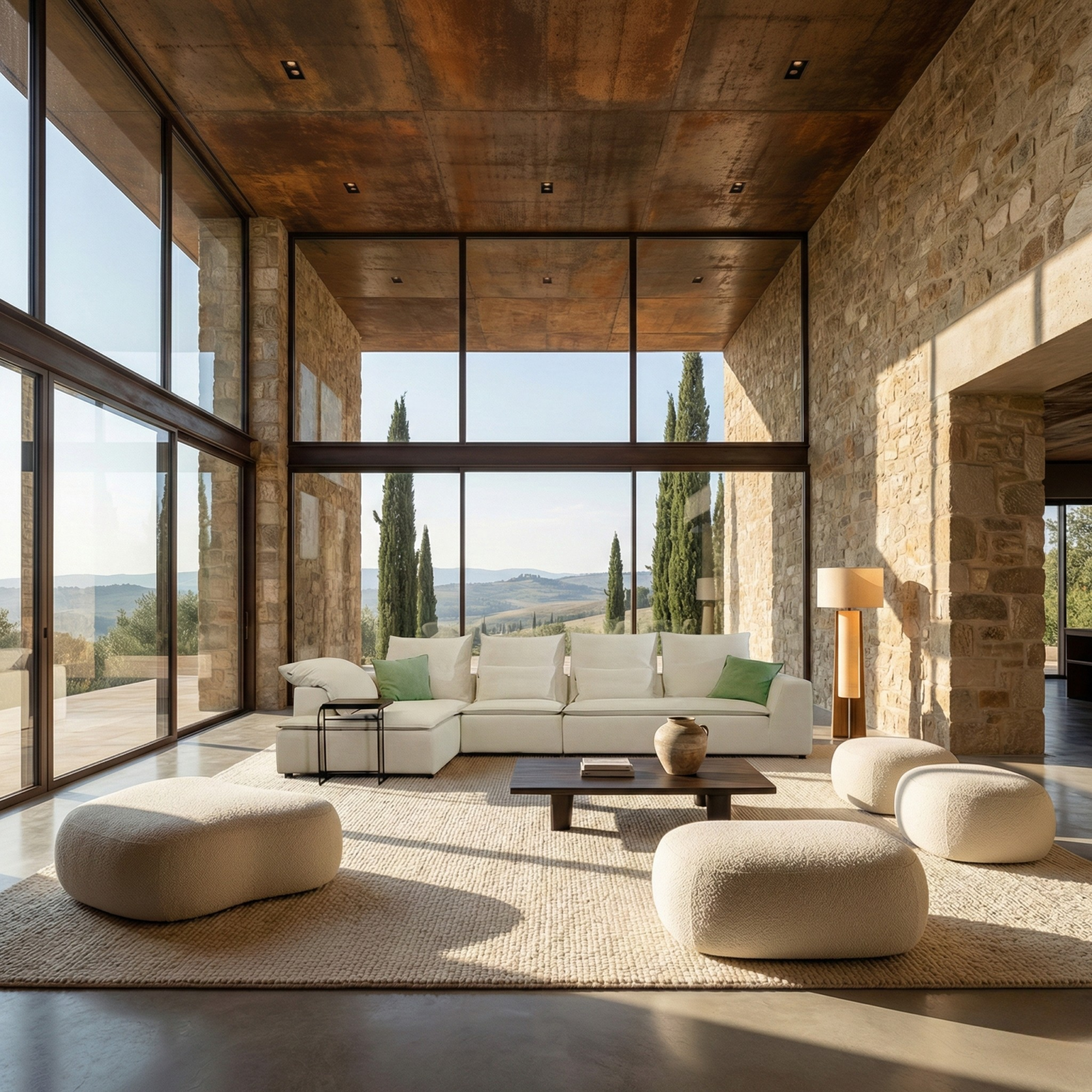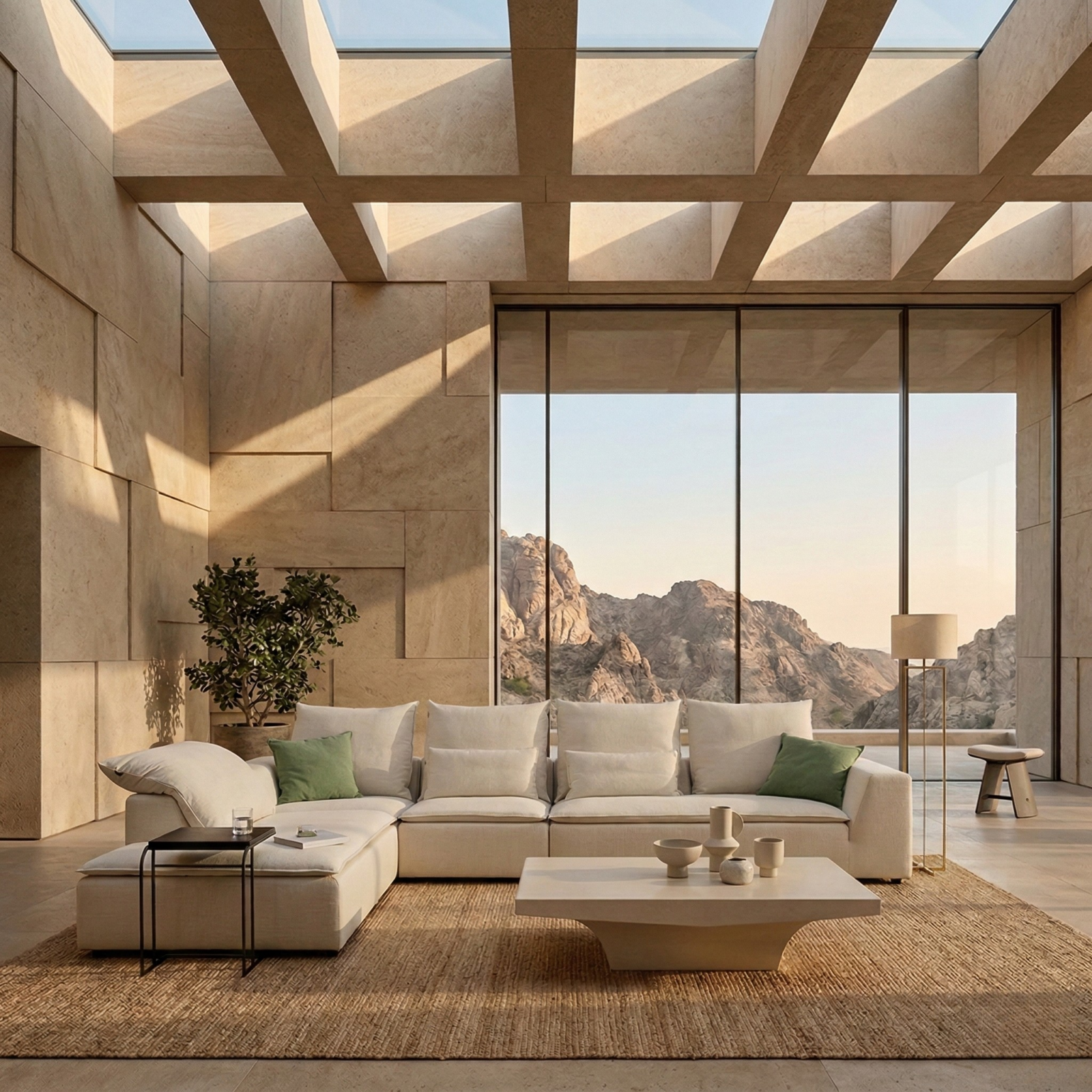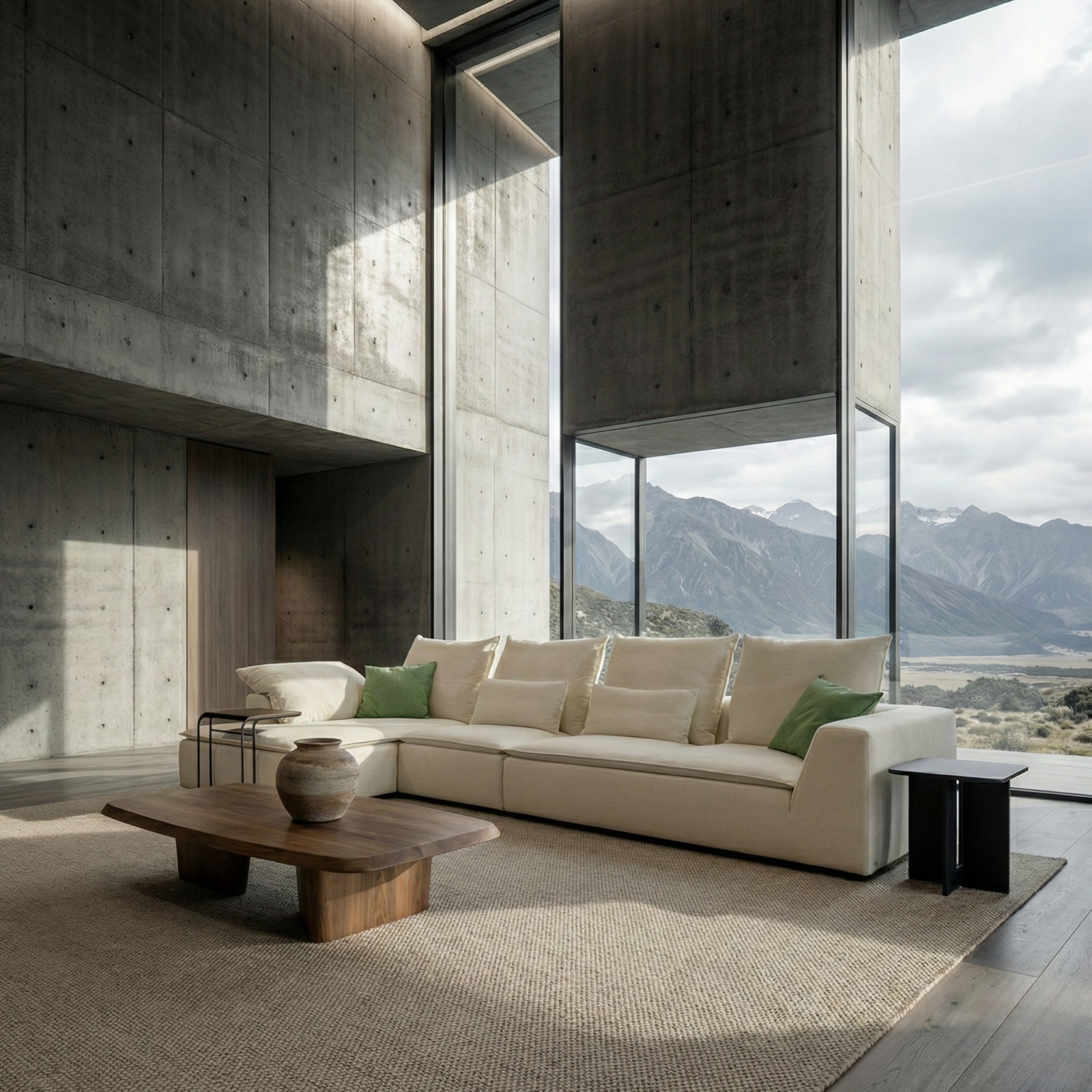 A calm modular sofa system with clean geometry, soft cushioning, and a grounded, architectural profile.