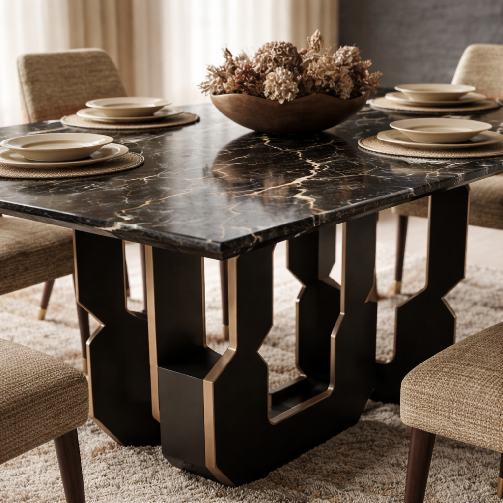 Logan Rectangular Dining Table – 2.1 memadukan kemewahan marmer hitam solid dengan kaki besi berlapis warna kopi dan emas, menghadirkan desain elegan dan kokoh untuk ruang makan modern Anda.