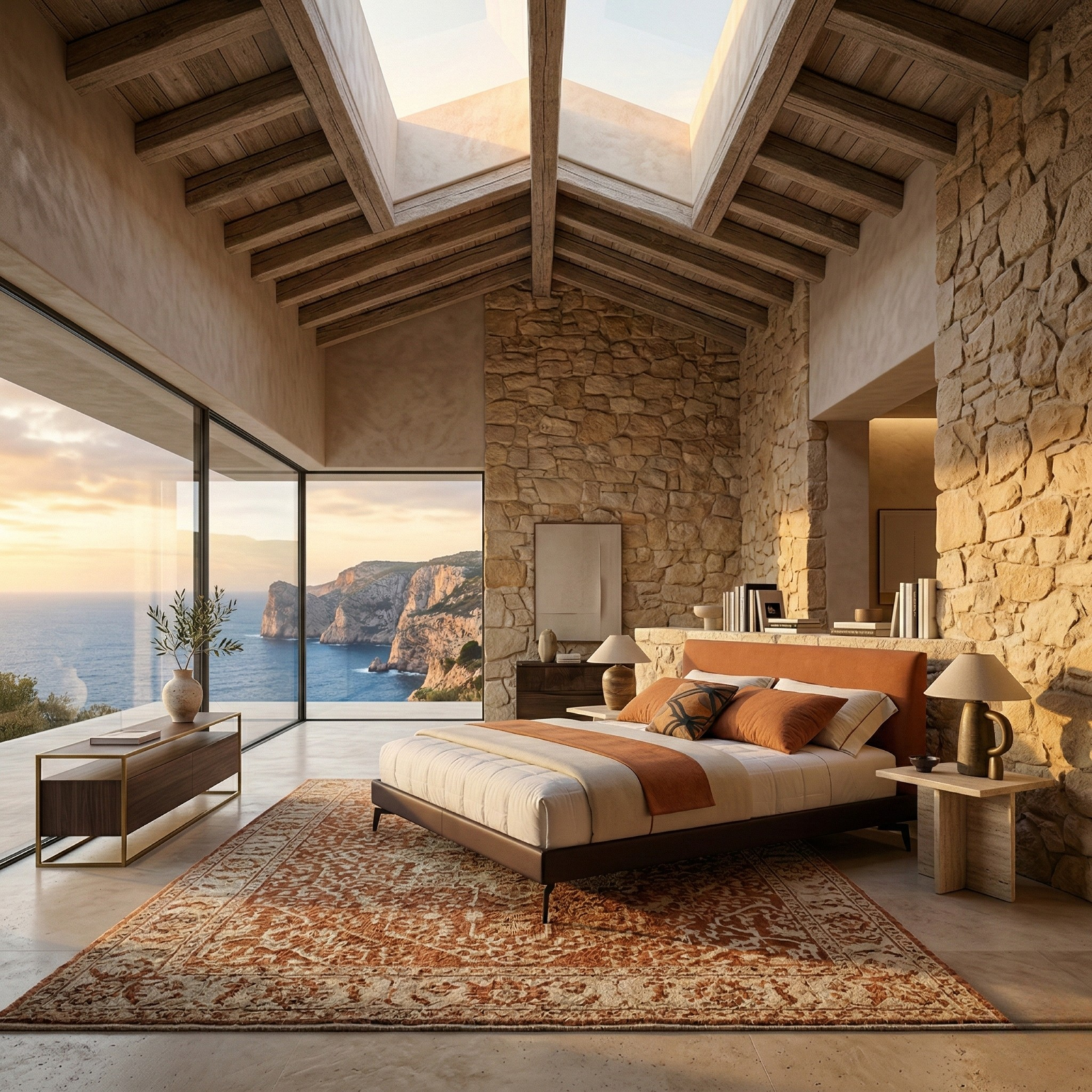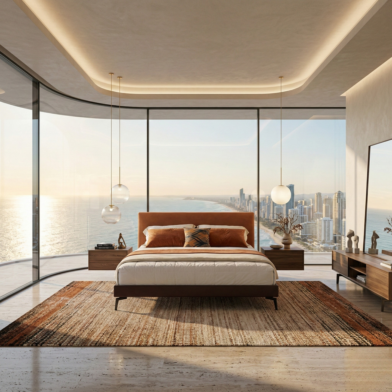 Its slim profile and lifted stance keep the form light and precise, while the generously sized platform is made for a 180 × 200 cm mattress, ideal for modern master bedrooms and premium hospitality suites.