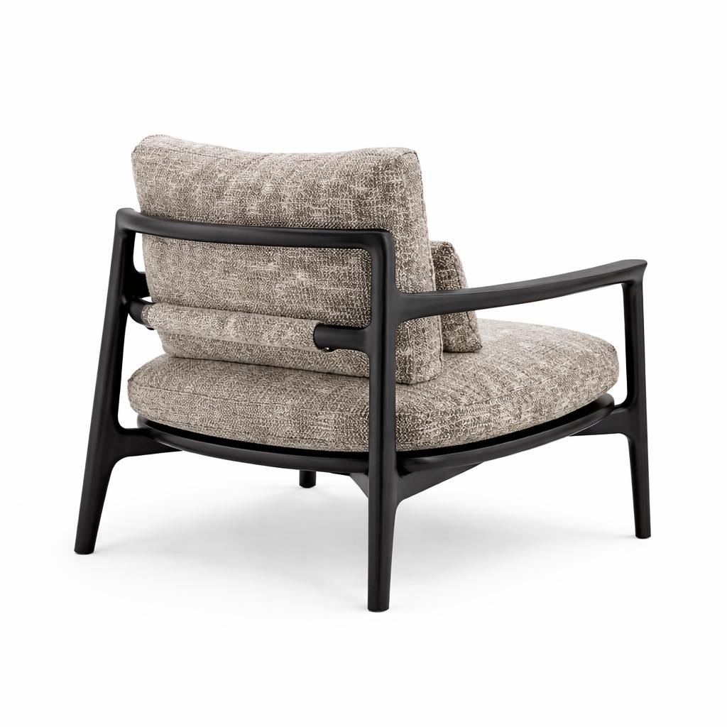 A continuous, sculpted frame defines the chair’s architectural outline, while the generously upholstered seat and back introduce comfort and depth. The frame wraps around the cushions with precision, creating a clear visual rhythm and a sense of containment without heaviness.