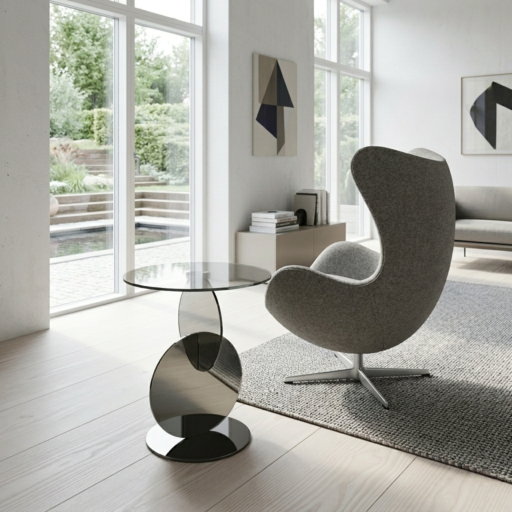 A sculptural side table defined by balance, reflection, and architectural simplicity.