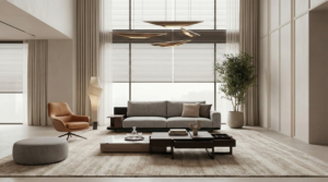 A refined 3-seater sectional with a low architectural base, softened by layered cushions and finished with a wood armrest detail.