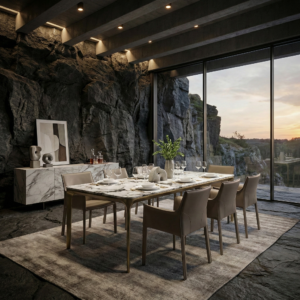 Pantheon Dining Table is defined by a light, architectural silhouette, clean lines, softened corners, and a quiet balance between stone and metal.