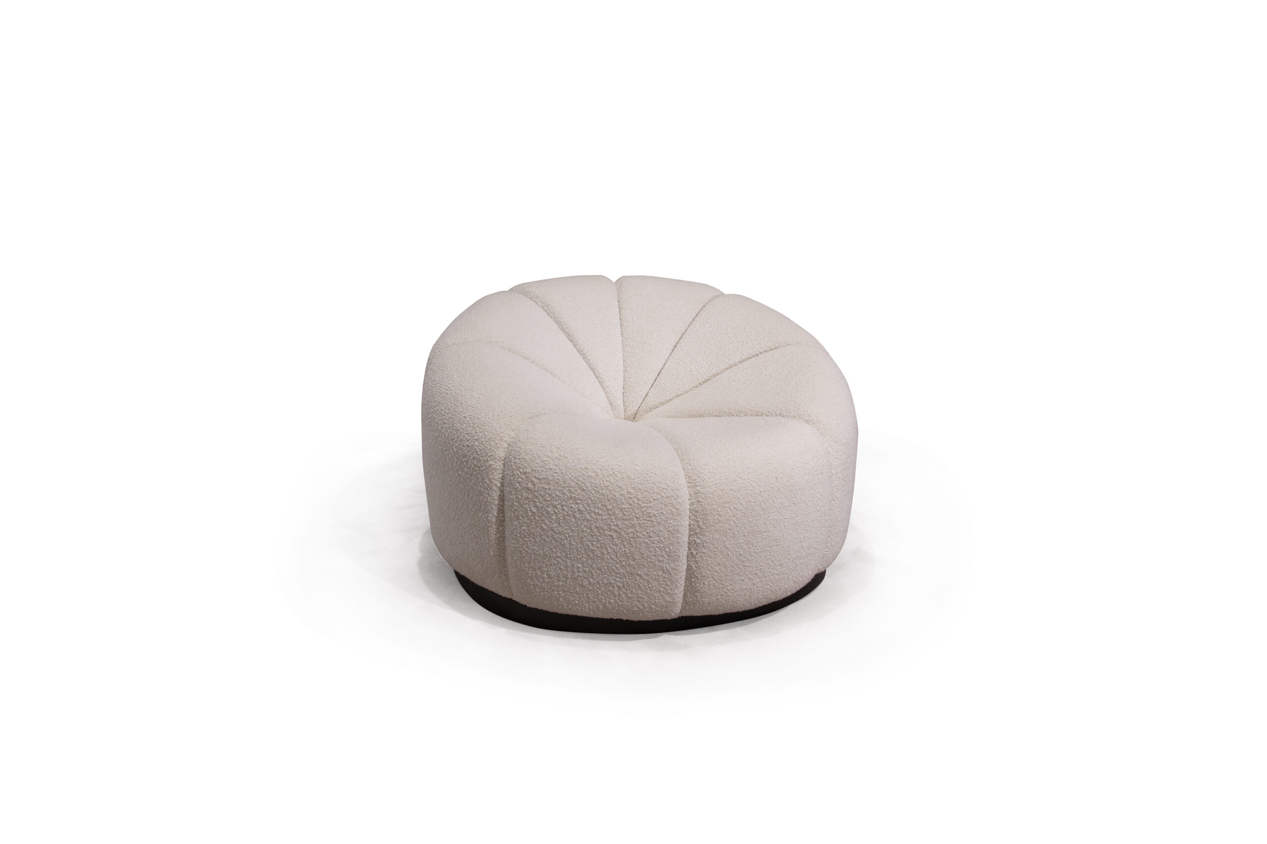 Its rounded silhouette is articulated through subtle radial segments that converge gently toward the center, creating a calm and tactile surface rhythm. The form is generous yet controlled, offering a sense of comfort while maintaining visual discipline.