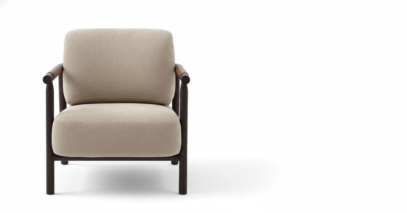 A solid wooden frame establishes a clear architectural outline, while the generously upholstered seat and back introduce softness and ease. Cylindrical armrests extend horizontally, reinforcing the chair’s linear expression and creating a balanced, composed posture.
