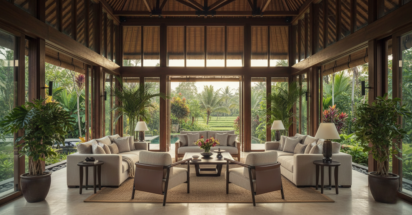A composed timber structure paired with soft upholstery, designed for refined modern interiors.