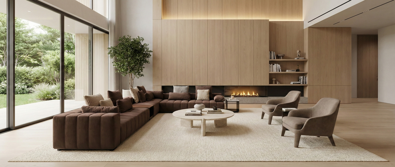 A low modular sofa system with structured channel detailing, designed to build calm, generous seating landscapes.