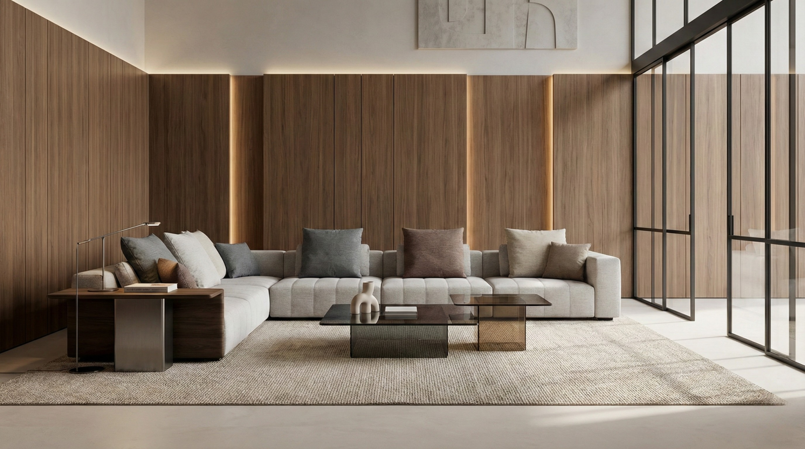 A modular, low-profile sofa system defined by clean geometry, channelled upholstery, and composed comfort.
