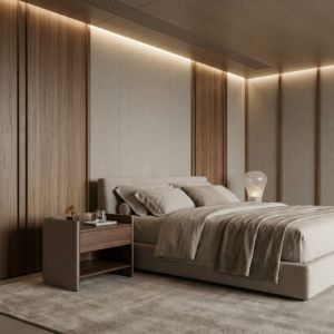 Built from veneer on MDF with microfiber leather, Robin is a balanced choice for minimalist bedrooms and hospitality interiors where material clarity and compact function matter.