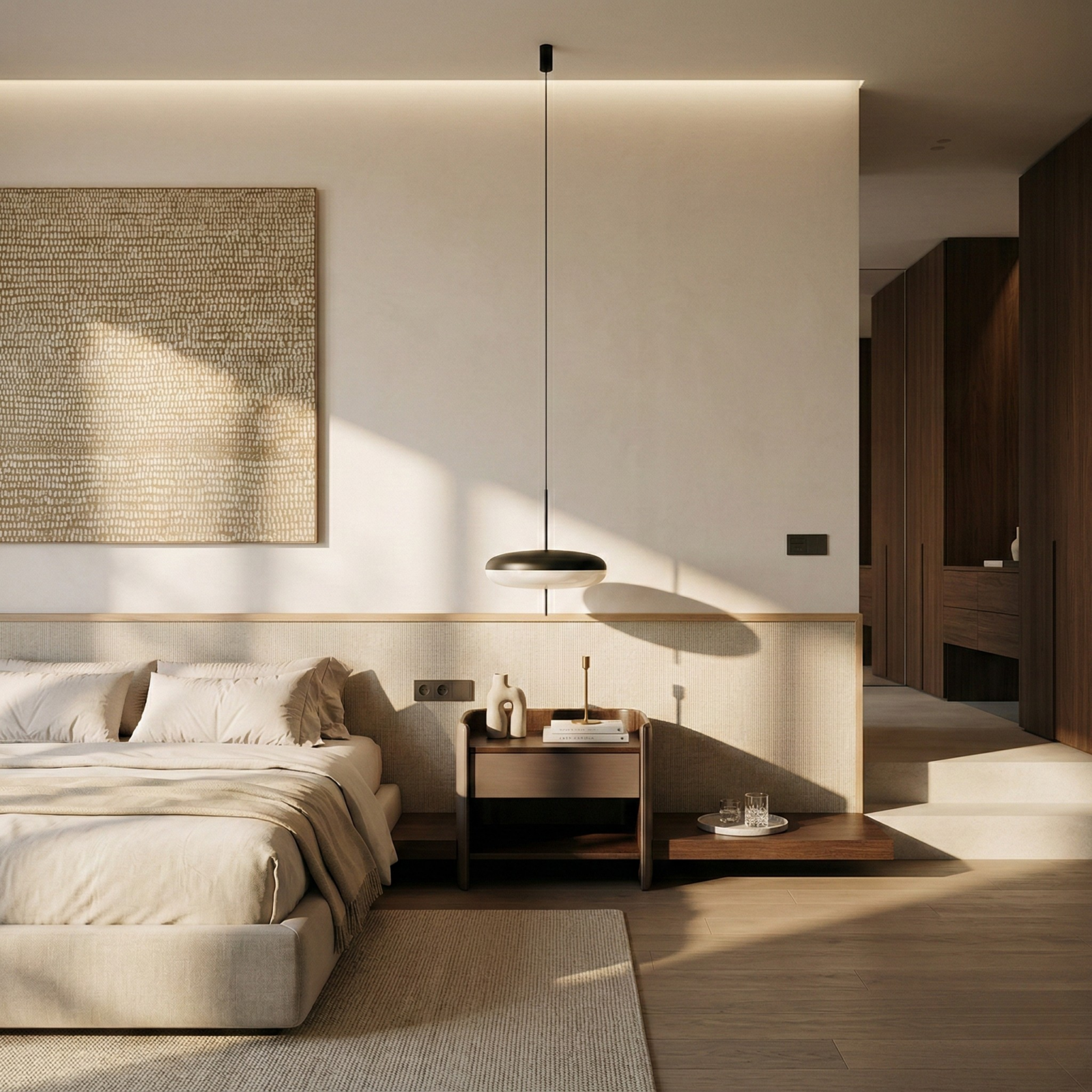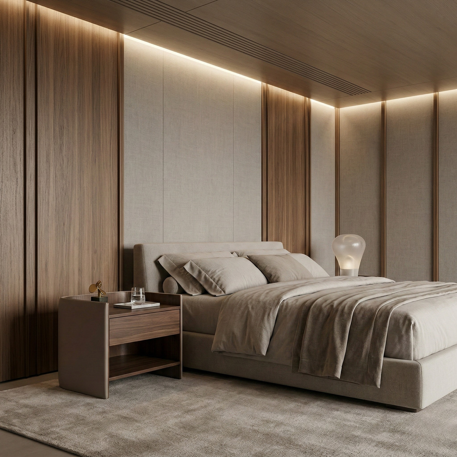 Built from veneer on MDF with microfiber leather, Robin is a balanced choice for minimalist bedrooms and hospitality interiors where material clarity and compact function matter.