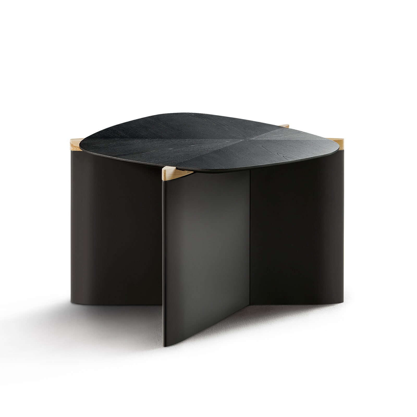 Its silhouette is softly squared and generously proportioned, creating a calm horizontal line that anchors the living space. The base is formed by intersecting curved panels, giving the table a sculptural stance while keeping the overall profile clean and contemporary.