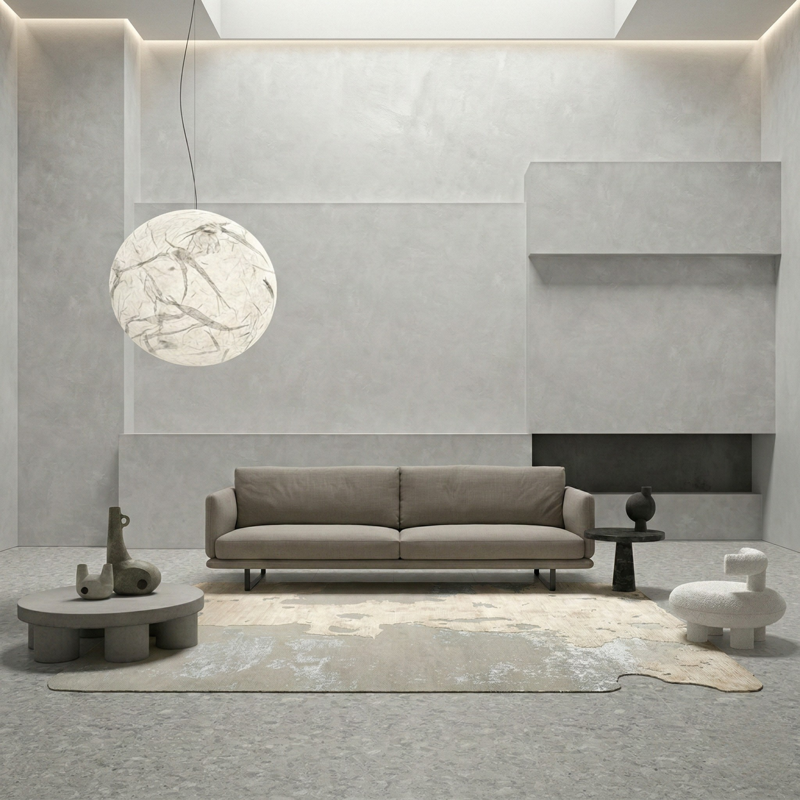 A calm, low-profile sofa with tailored upholstery and a refined architectural stance.