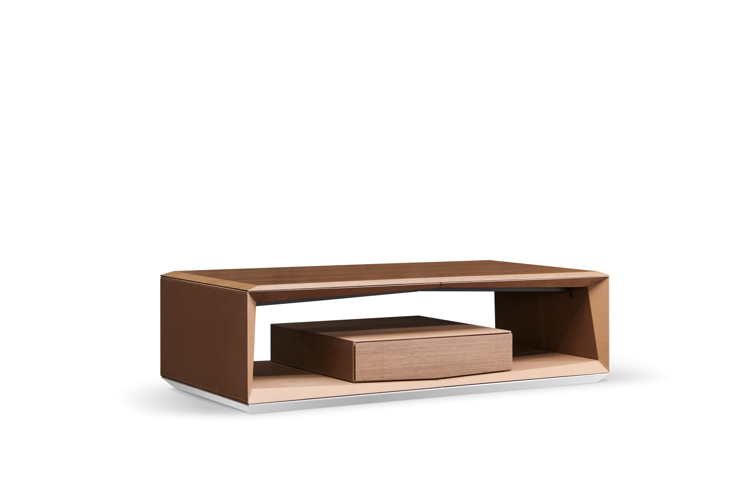 is conceived as a low, architectural anchor that brings balance and refinement to executive lounge and meeting areas. Its clean horizontal profile is framed by solid side volumes, creating a strong yet composed presence that complements the larger pieces of the Strata collection. An open lower plane and integrated central element introduce depth and functionality without visual excess, allowing the table to serve both display and everyday use. Finished with the same meticulous attention to material and proportion, the Strata Coffee Table completes the space with quiet authority—subtle in height, confident in character.\