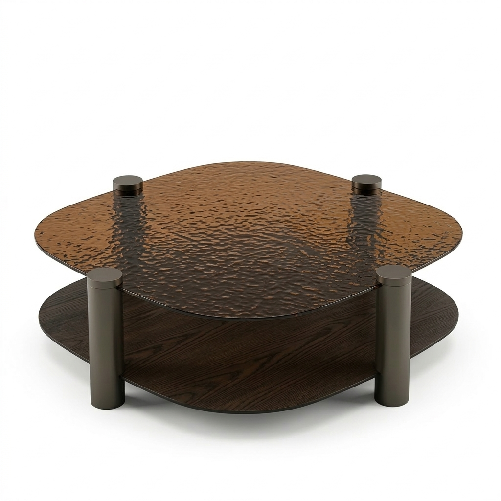 The large coffee table features a distinctive hammered glass top, where the irregular surface subtly diffuses light and adds depth to the composition. Beneath it, a secondary wooden layer introduces warmth and material contrast, supported by cylindrical metal columns that define the structure with precision and rhythm.