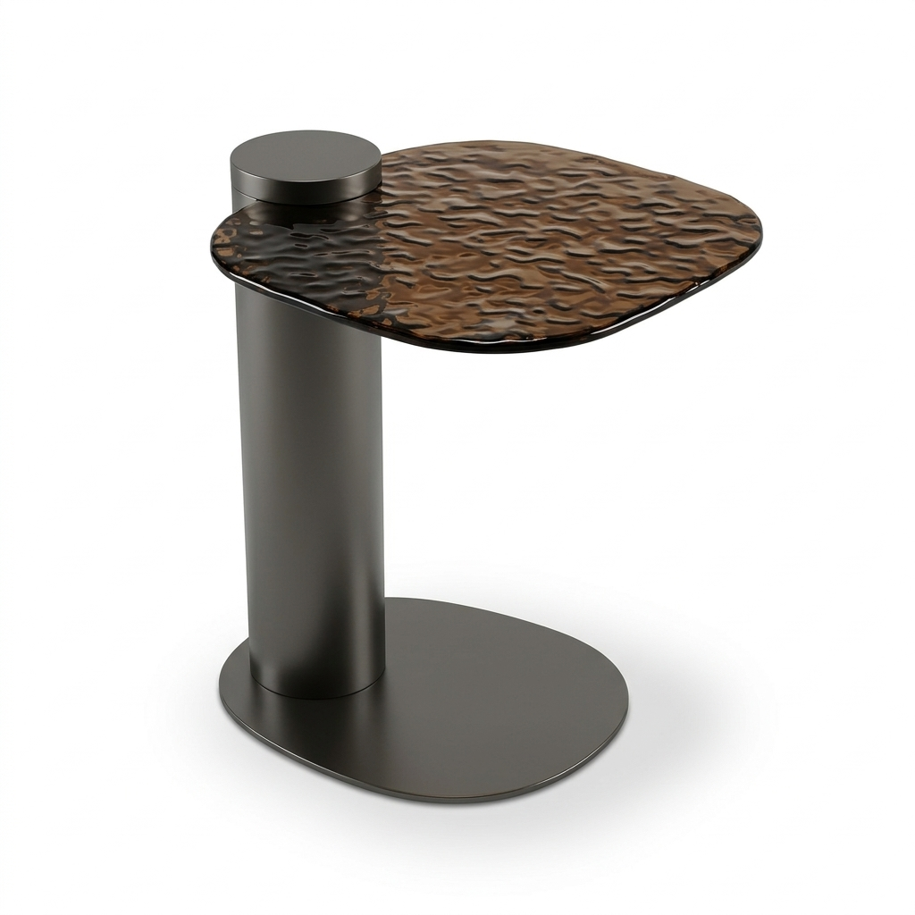 The smaller companion table echoes the same design language in a more compact and elevated form. Its slender pedestal base supports a similarly textured glass top, allowing it to function as a flexible side table or as part of a layered arrangement with the main table.