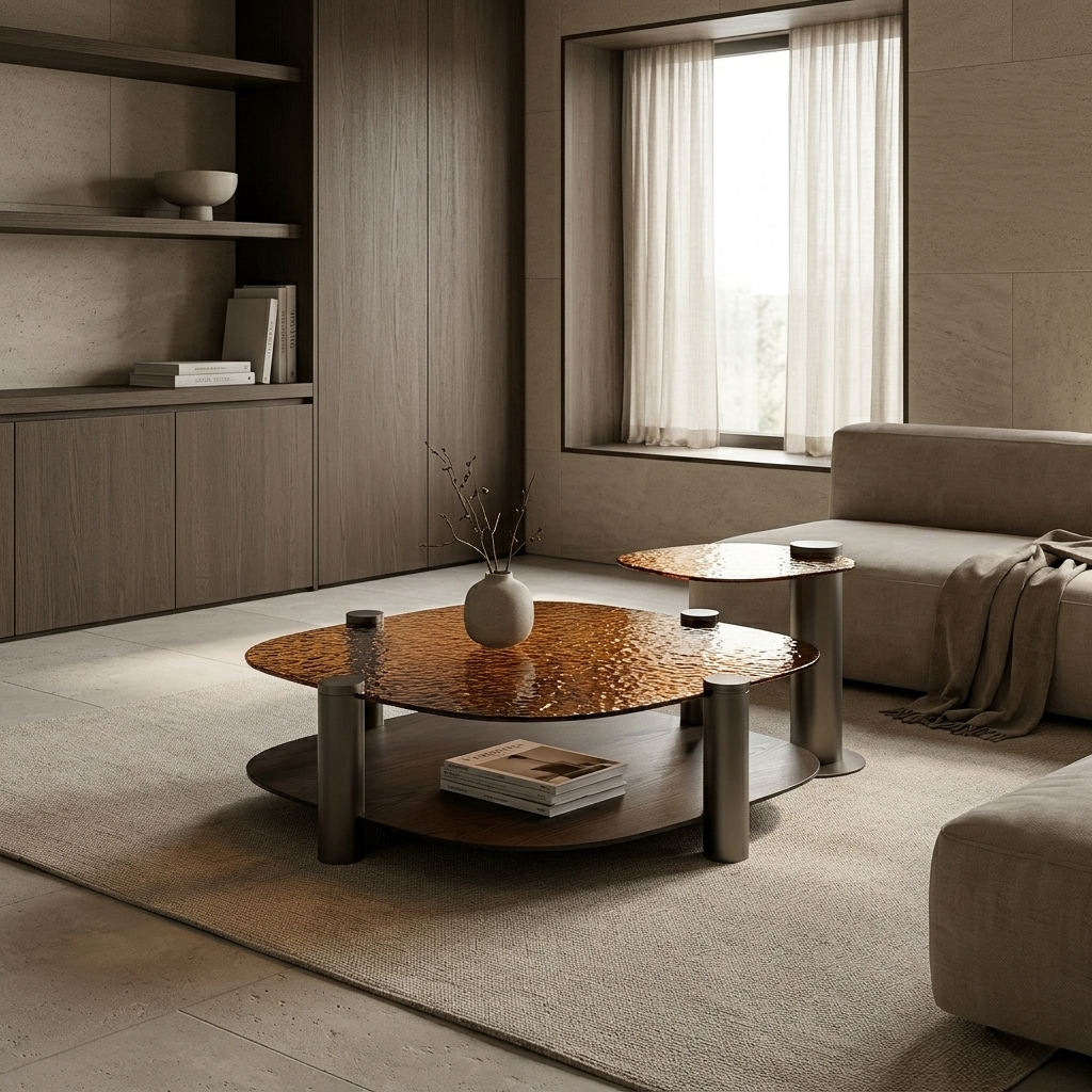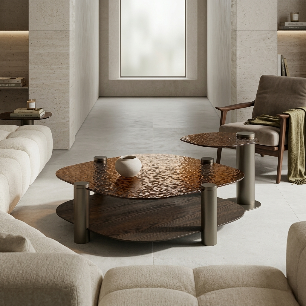 The Tarvex Coffee Table Set explores the interplay between material richness and geometric clarity. Designed as a two-piece composition, the set combines hammered glass surfaces with structured wood and metal elements, creating a refined balance between texture, transparency, and solid form.