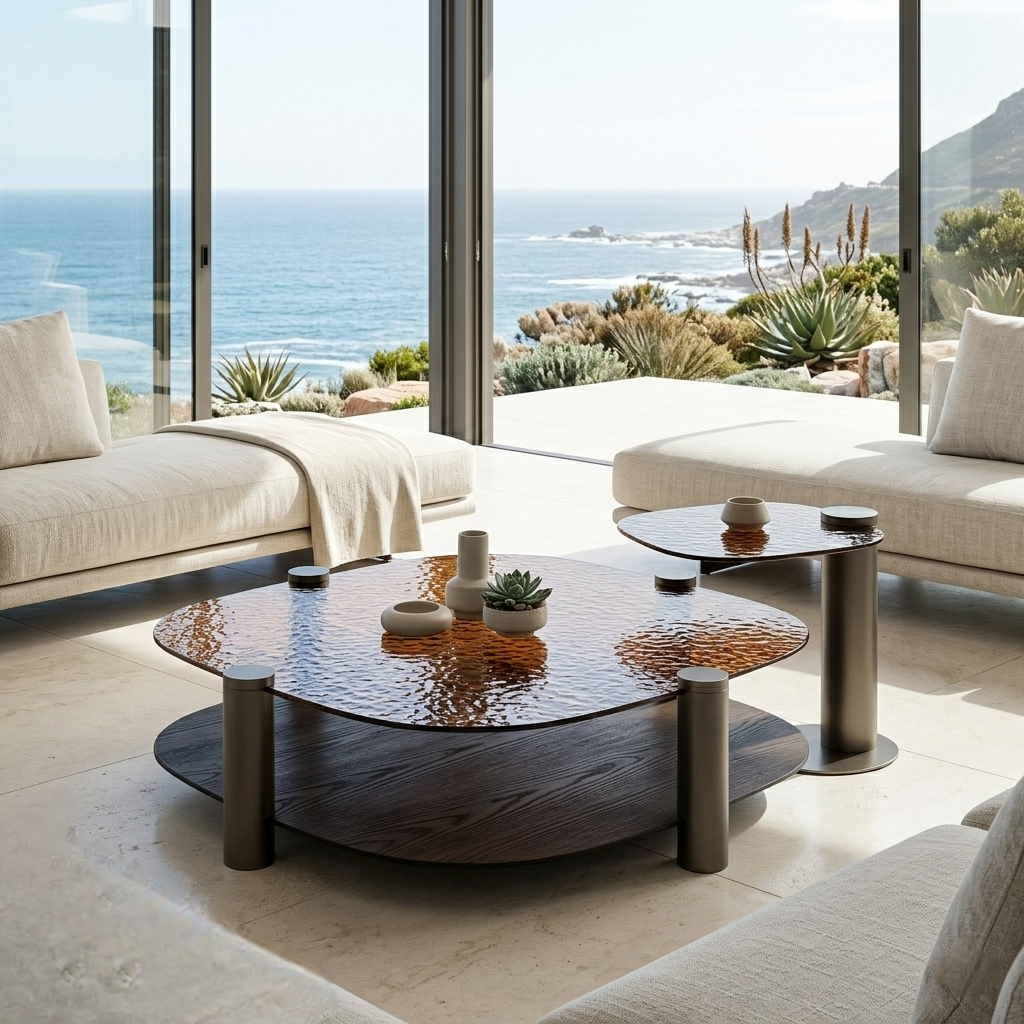 A sculptural coffee table set defined by layered composition, textured glass, and architectural structure.