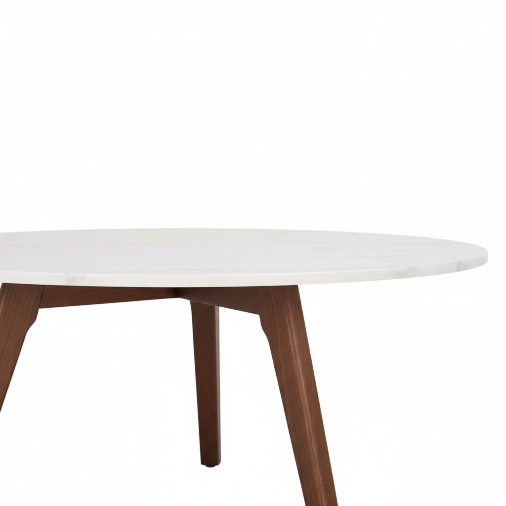 Kedua varian ini dipadukan dengan kaki meja dari kayu solid berwarna Dark Walnut, diproses dengan teknik finishing presisi untuk menonjolkan serat alami kayu sekaligus memberikan stabilitas optimal. Sudut kaki yang dirancang dengan cermat menciptakan keseimbangan visual dan struktural, memastikan meja tetap kokoh tanpa kehilangan kesan ringan dan elegan.