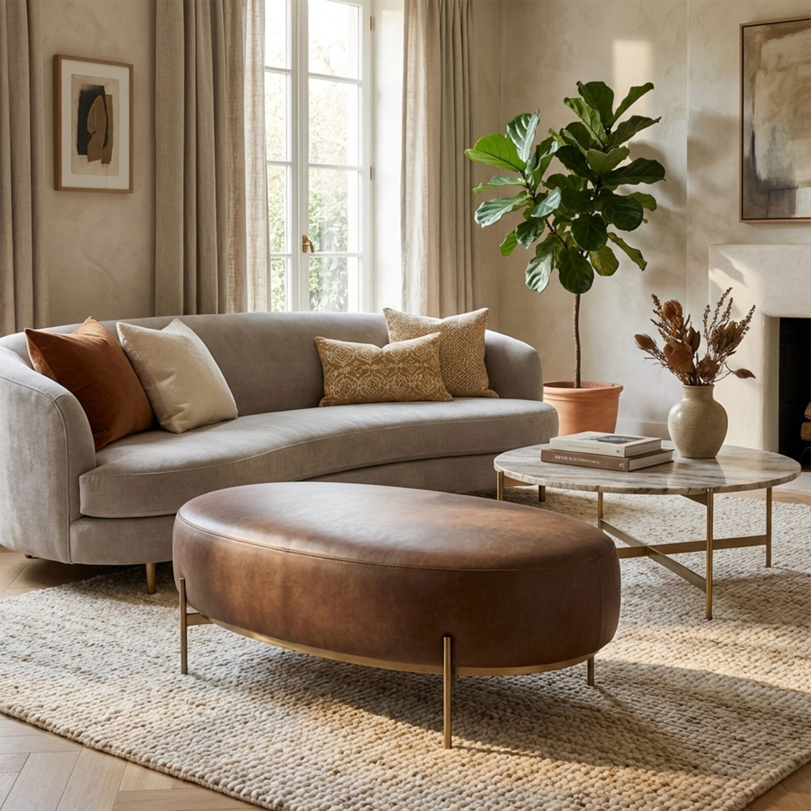 - Ditempatkan di ruang tamu sebagai ottoman elegan atau tempat duduk tambahan yang siap digunakan kapan saja.