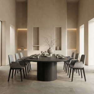 Its proportions are designed for easy placement around both round and rectangular tables, offering a clean, tailored look that pairs effortlessly with a wide range of finishes.