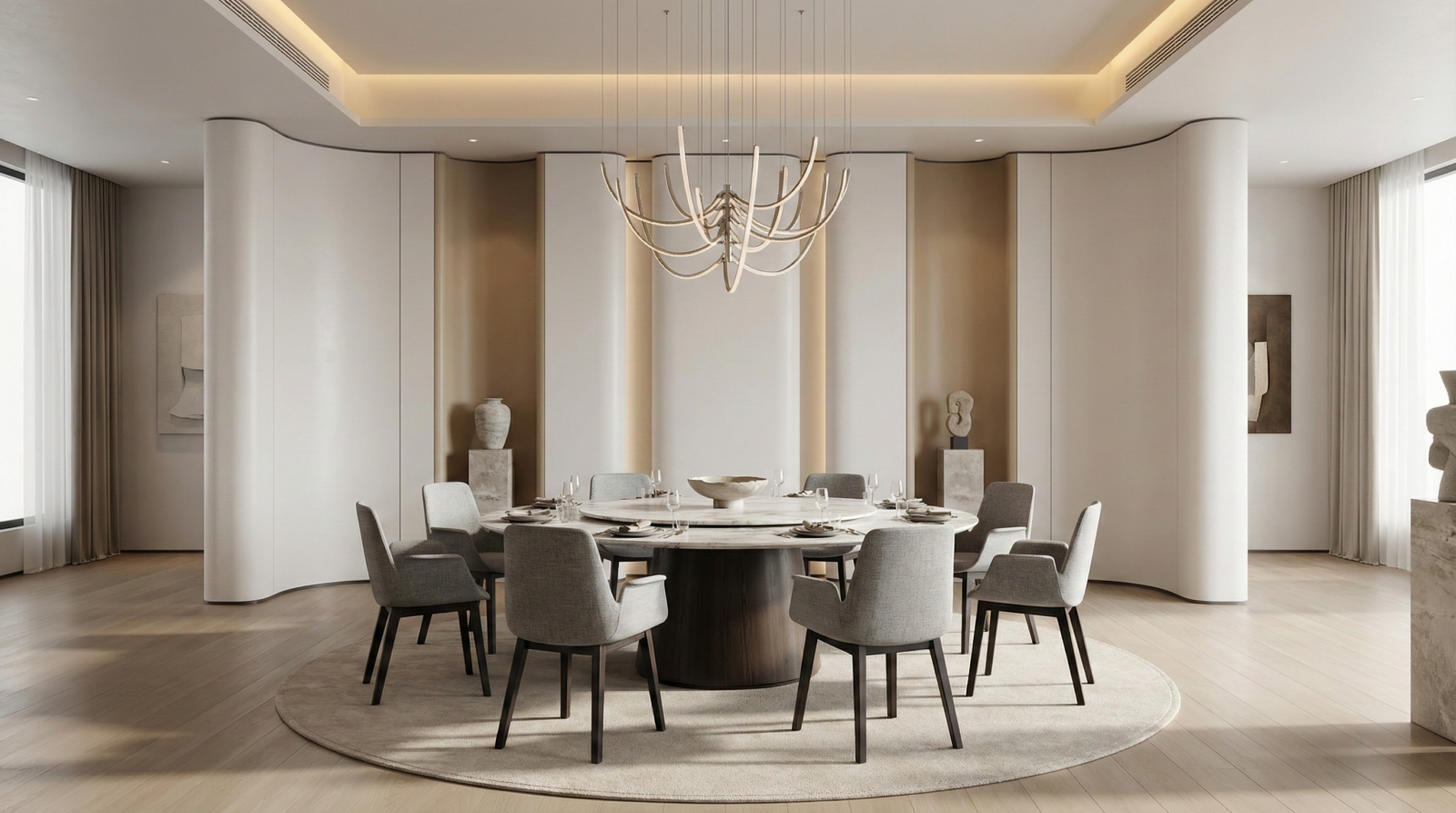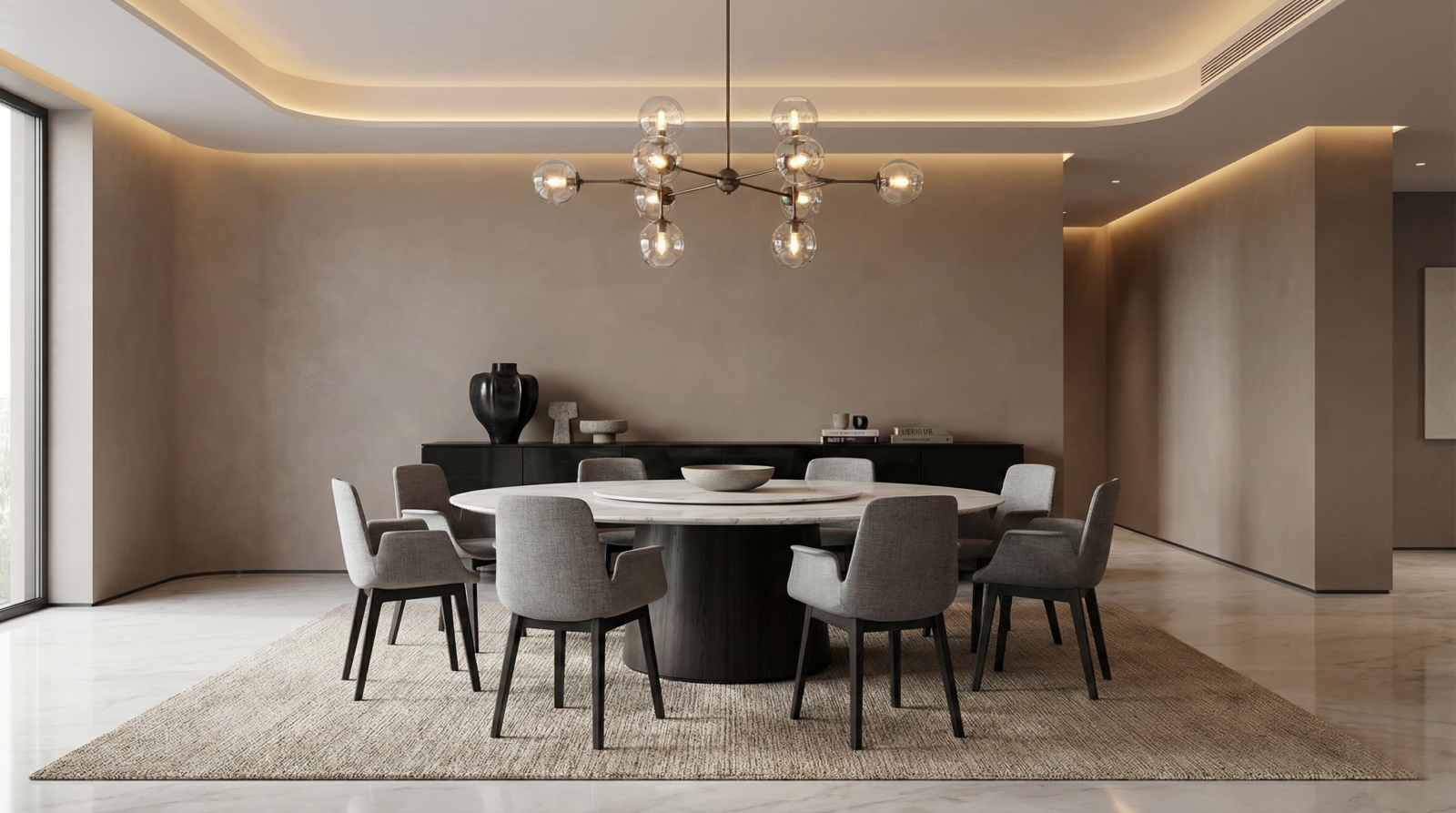 Its proportions are designed for easy placement around both round and rectangular tables, offering a clean, tailored look that pairs effortlessly with a wide range of finishes.