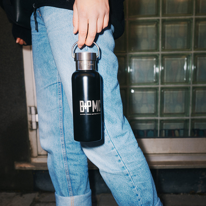 A water bottle with matt black and raw finish made from durable, thermally insulated double-walled stainless steel, with stainless steel top cap and loop.