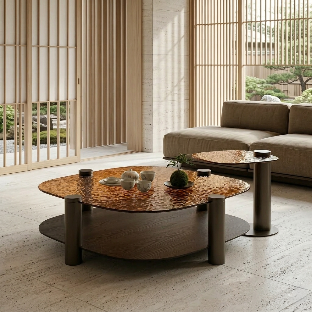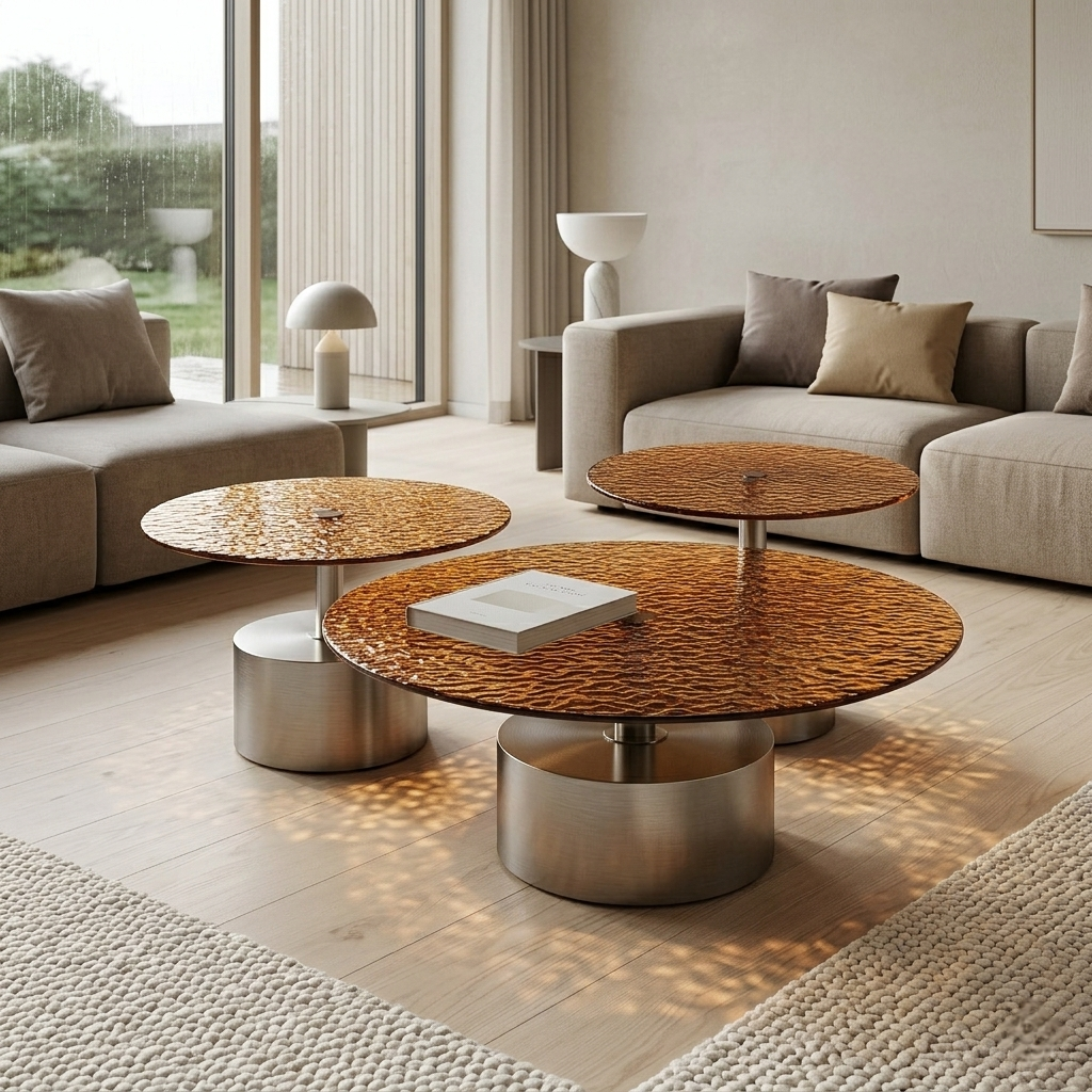The Zorven Coffee Table Set presents a composition of three circular tables designed to function together as a dynamic architectural arrangement. Each piece features a hammered glass surface, creating a rich tactile quality that captures and diffuses light, bringing depth and subtle movement to the tabletop.