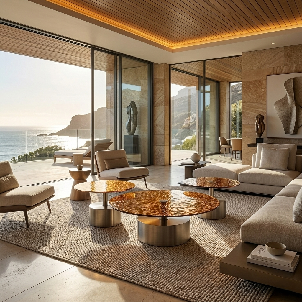 The varying diameters and heights allow the tables to overlap and interact fluidly, forming a layered landscape within the living space. This multi-level composition introduces flexibility in use, whether as a central coffee table cluster or as individual accent pieces.