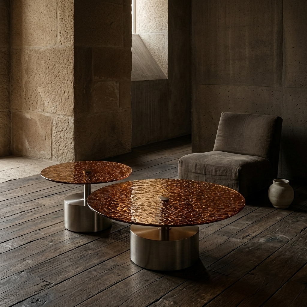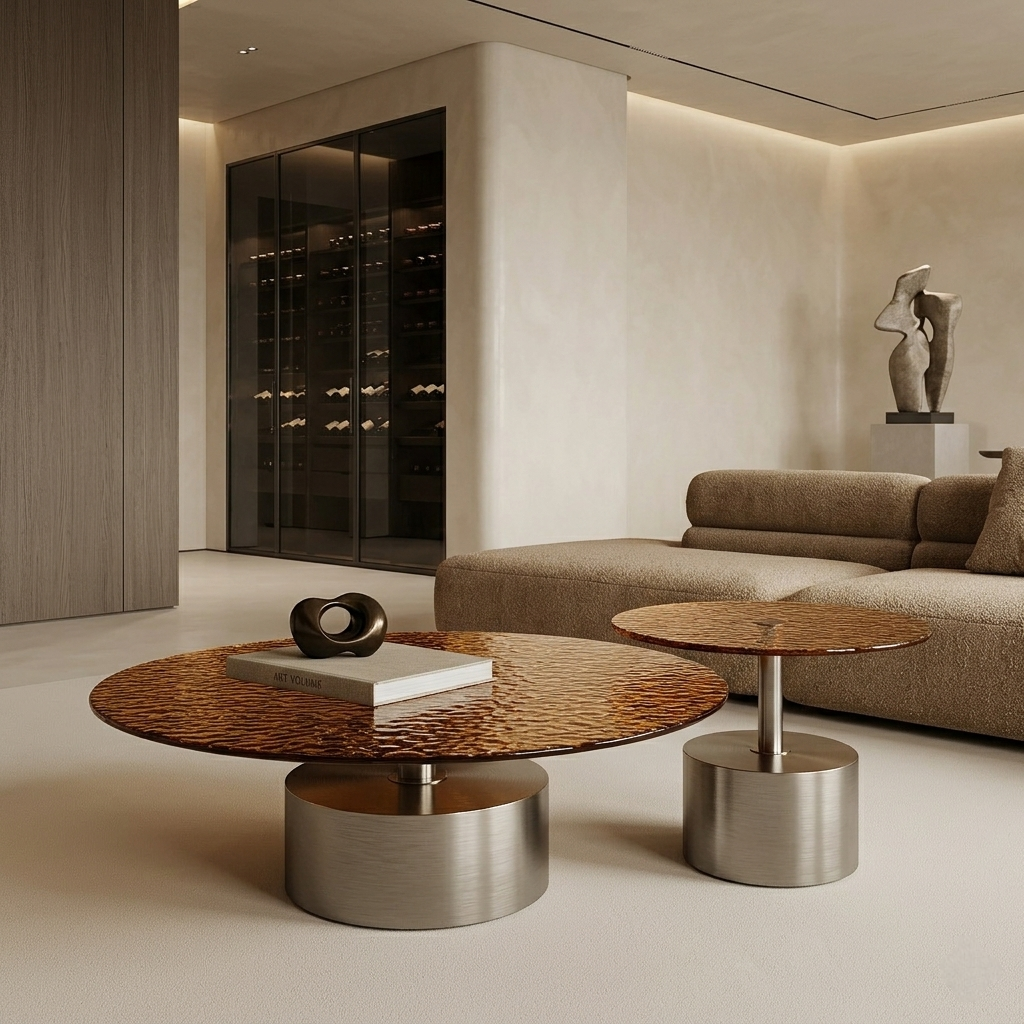 Supporting the tops are cylindrical metal bases with a clean, brushed finish. The slender vertical connection between the base and tabletop enhances the sense of lightness, allowing the textured glass surfaces to visually float above the structure.