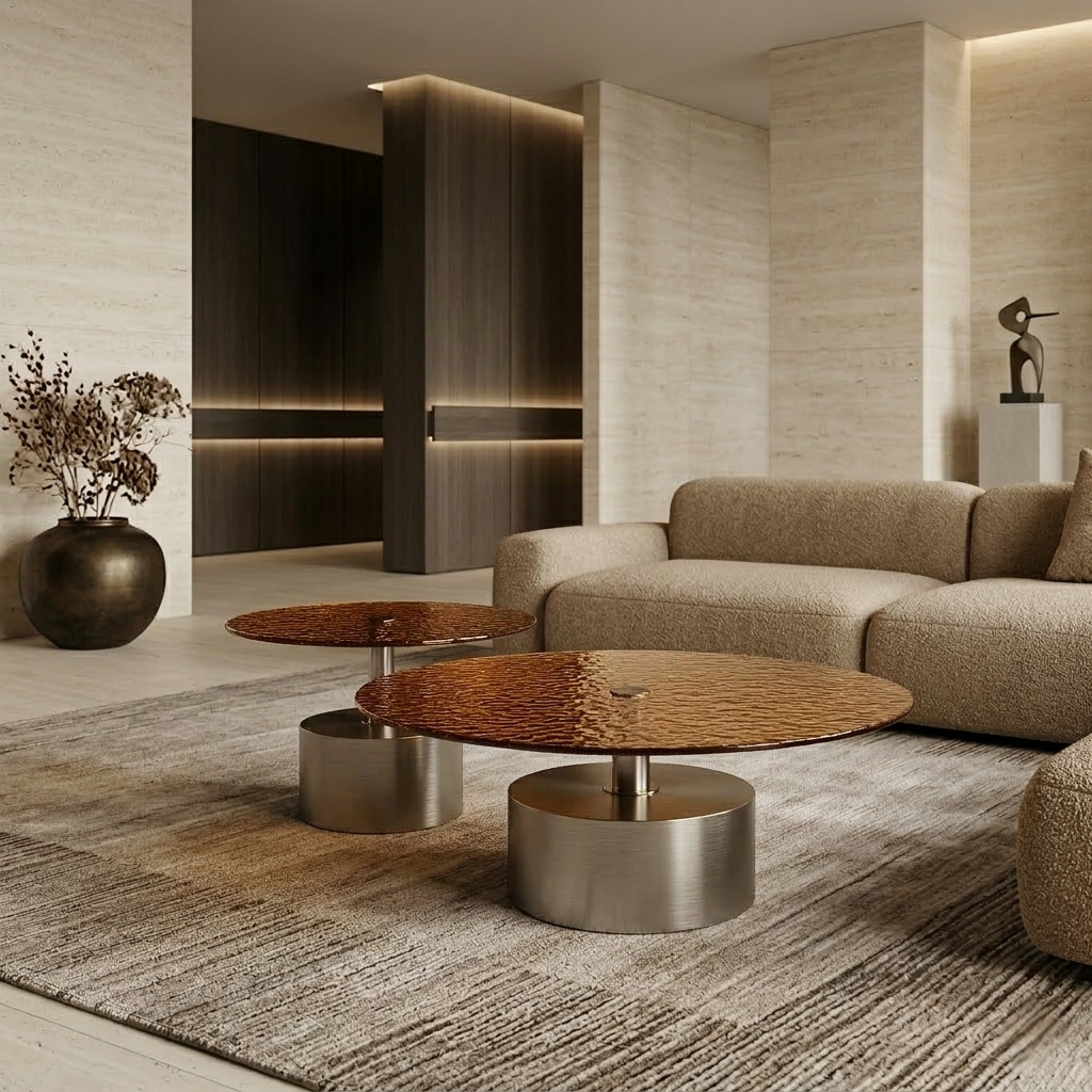A sculptural coffee table set defined by layered heights, textured glass, and refined metallic structure.